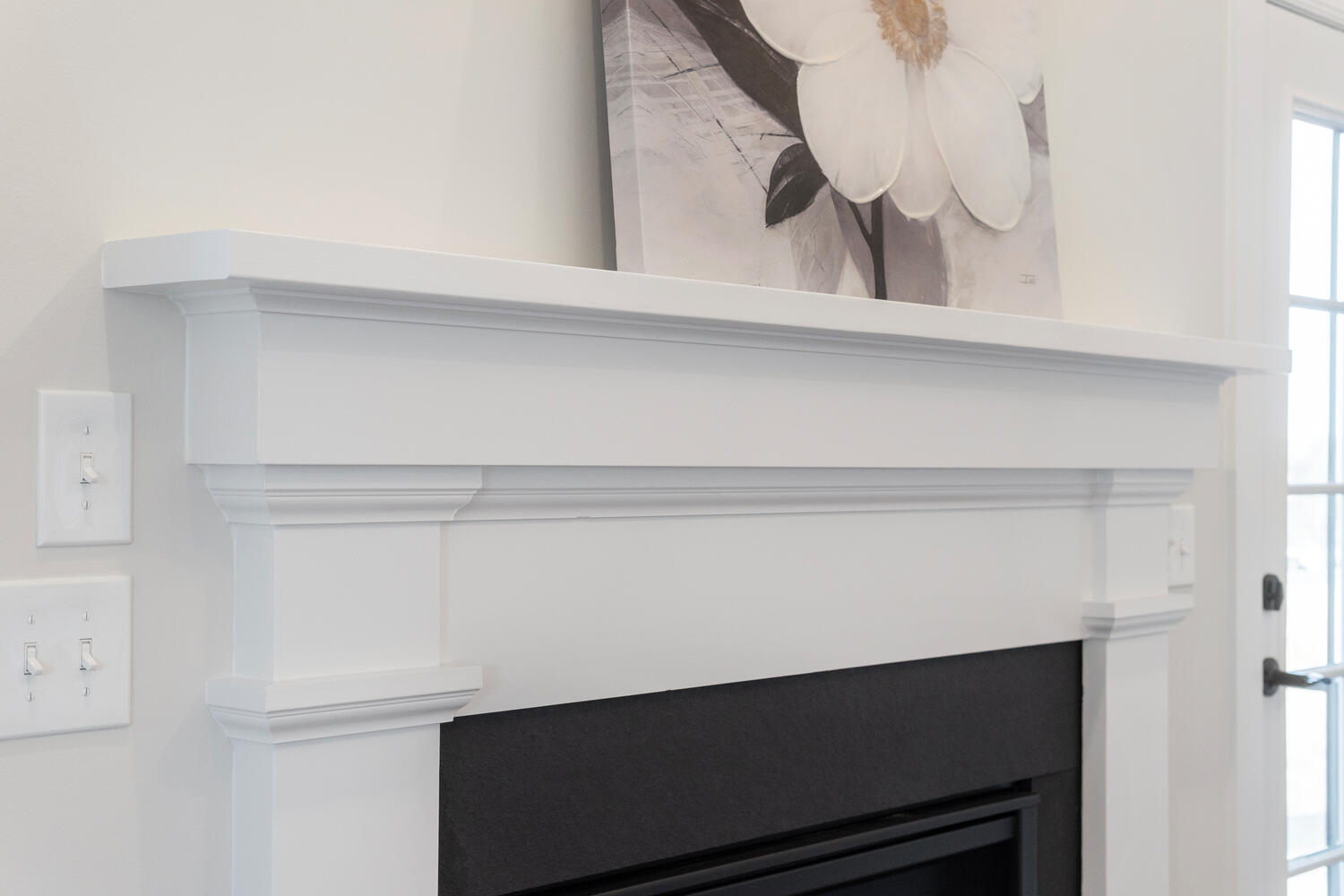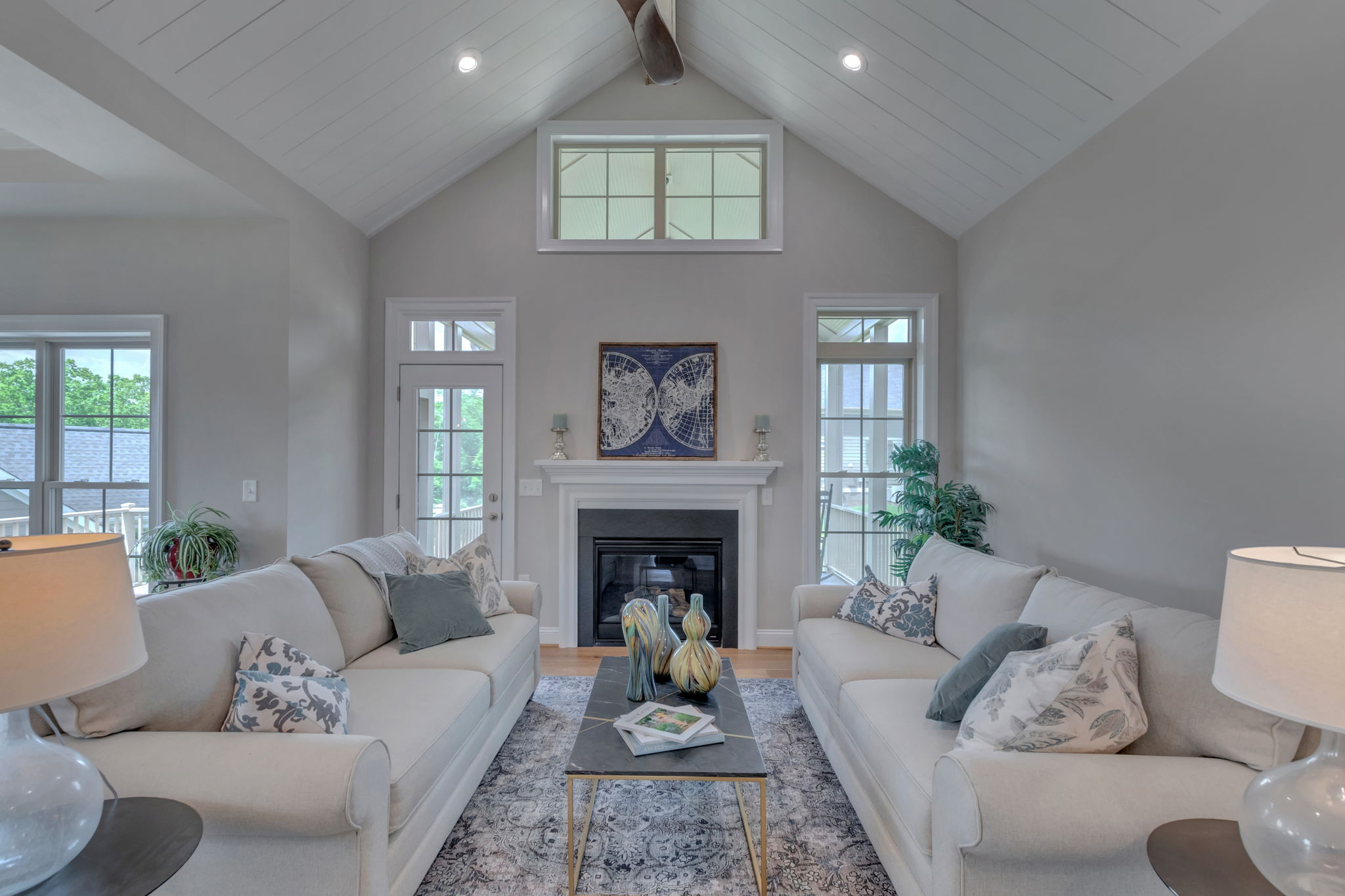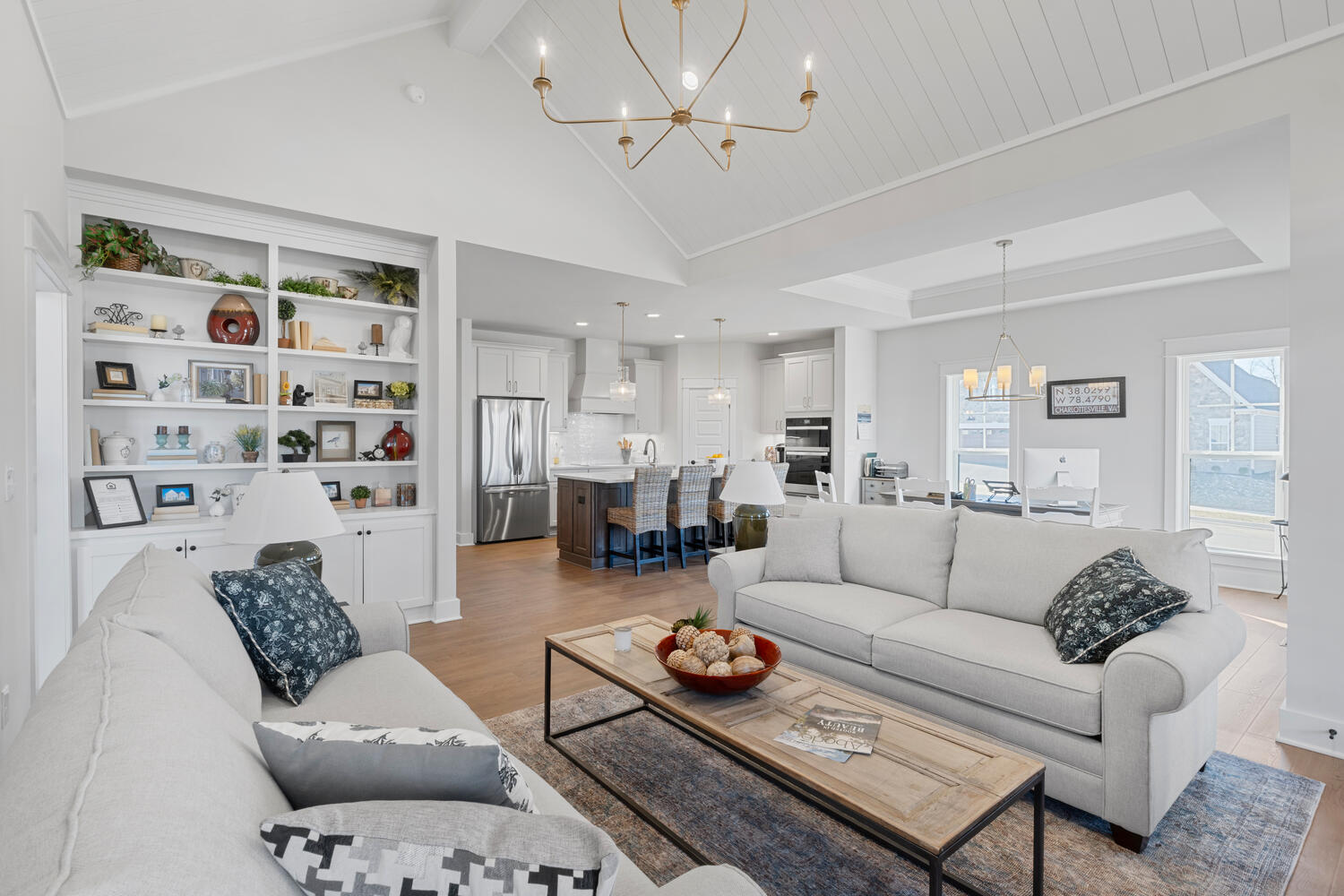 The Great Room, with its distinctive vaulted ceiling, is the focal point of the home. It is filled with natural light and boasts a fireplace and optional built-in bookshelves.