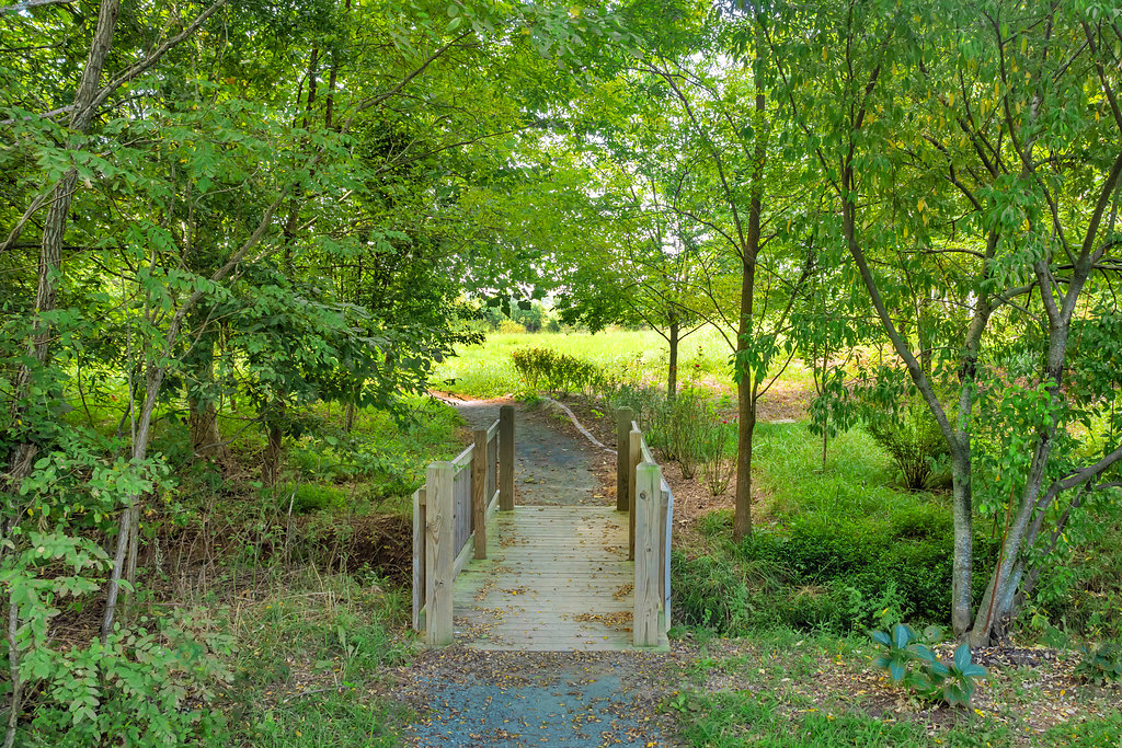 A peaceful photograph of one of the many walking paths scattered throughout Old Trail Village. Bright green trees shade a wooden bridge crossing a small stream.
