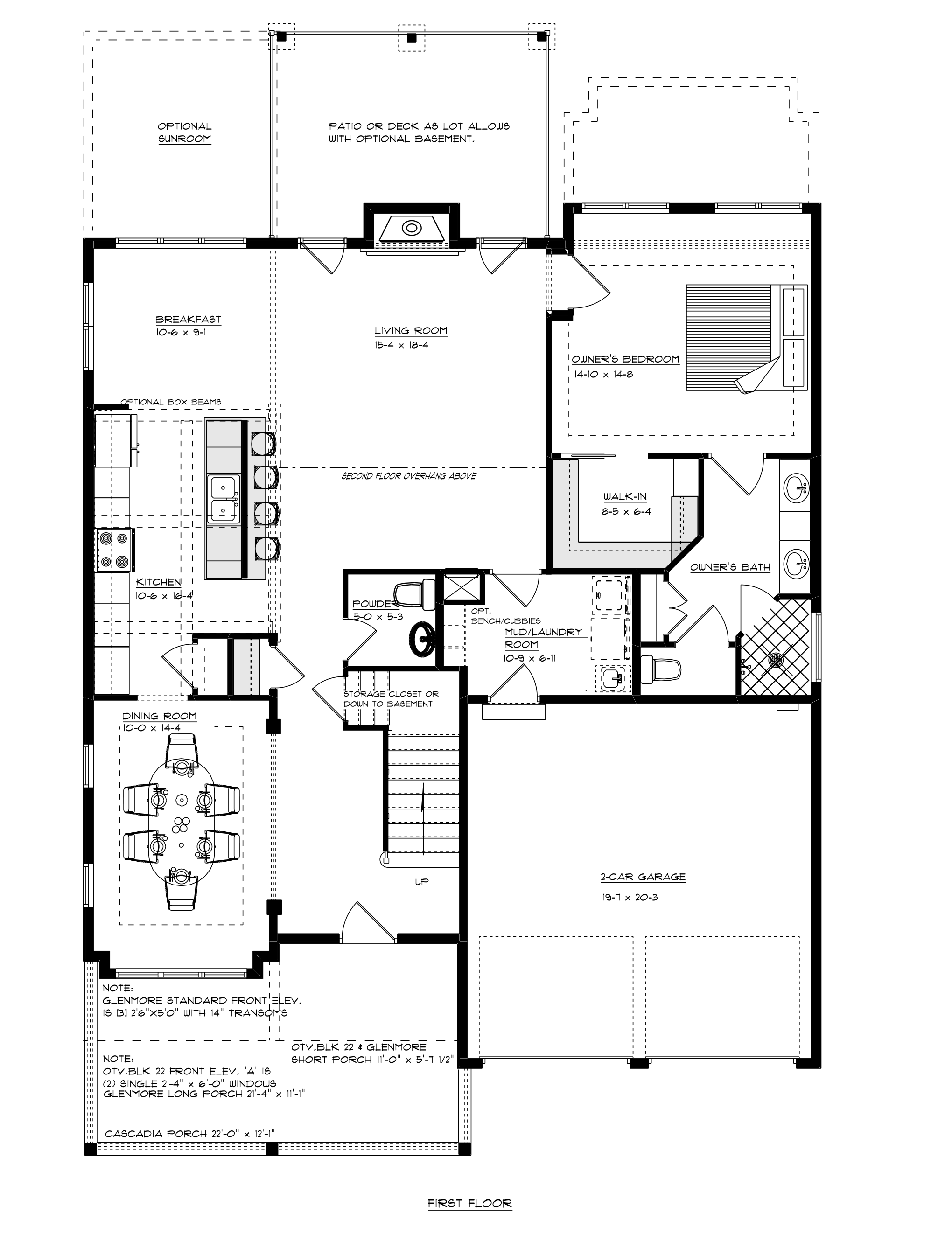 The Fairway offers an open floor plan with a two-story Great Room that boasts an entire wall of windows that bring the outside in, with abundant natural light and sweeping views of the beautiful surroundings. The Fairway’s flexible floor plan is designed to fit any lifestyle, with a first floor Owner’s Suite and Laundry, and an additional two Guest Bedrooms, two full Baths and an optional finished Bonus Room upstairs. The Foyer opens to an elegant Dining Room on one side, while the main hallway accesses a Powder Room and Living Room. The Great Room features vaulted ceilings and leads to an outdoor deck and a Breakfast Dining area, which connects the Kitchen to the optional Sunroom.