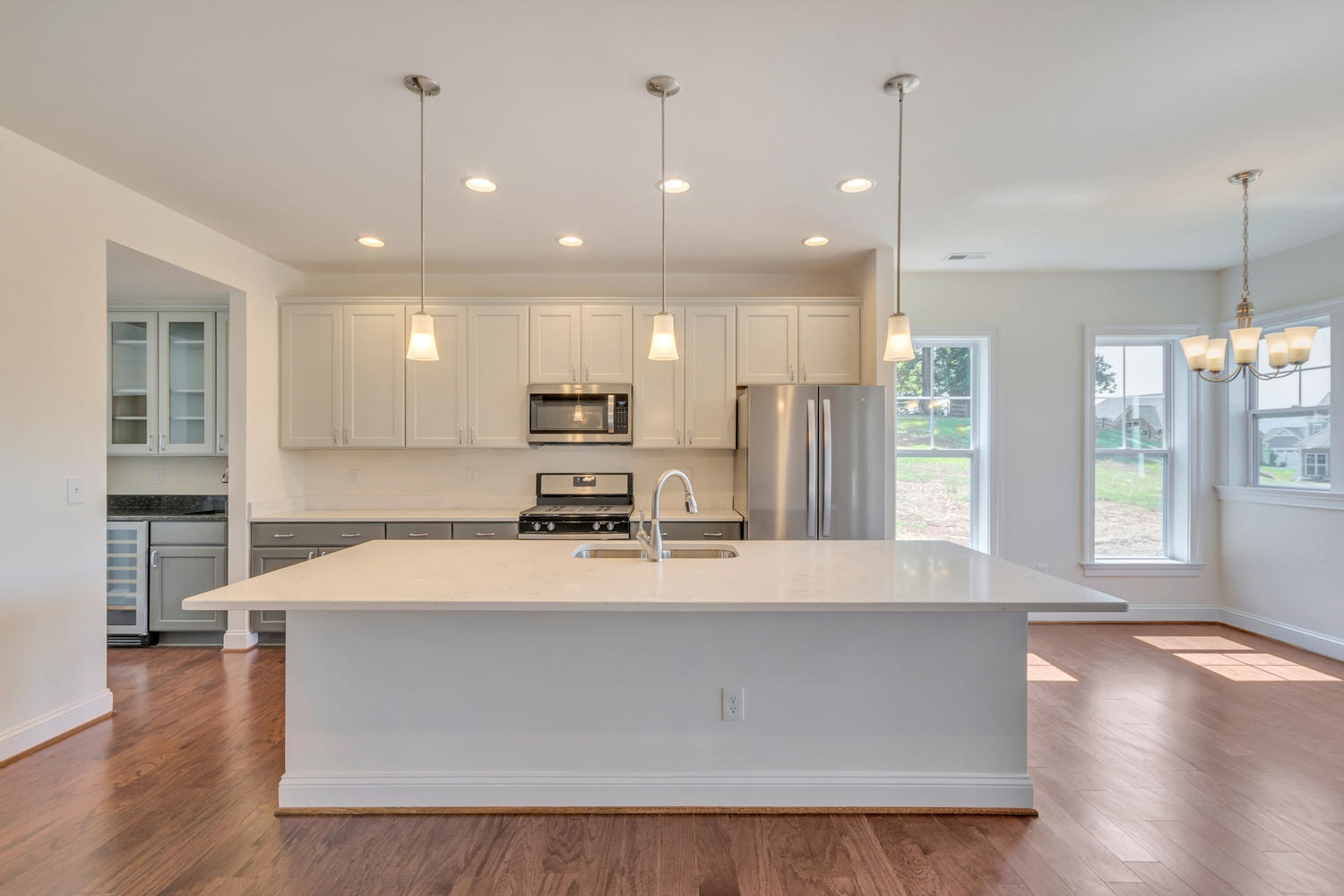 The Lynnhaven offers a host of features that are both beautiful and practical. The Kitchen features a nine-foot island with options for a central cooktop. A walk-in Pantry and Serving Bar allow the clutter to be hidden. The Lynnhaven has three dining areas: the island, the Dinette and the formal Dining Room, which includes a pass-through to the Kitchen. An optional handicap-accessible room off the Great Room can function as a Study or Guest Room and includes an upgraded Bathroom and walk-in closet. The oversized Garage can have doors on the front or side and has space for cars, garbage and storage. The adjacent Mud Room has separate access. The Basement also offers flexible function – attractive double doors divide the finished and unfinished spaces.