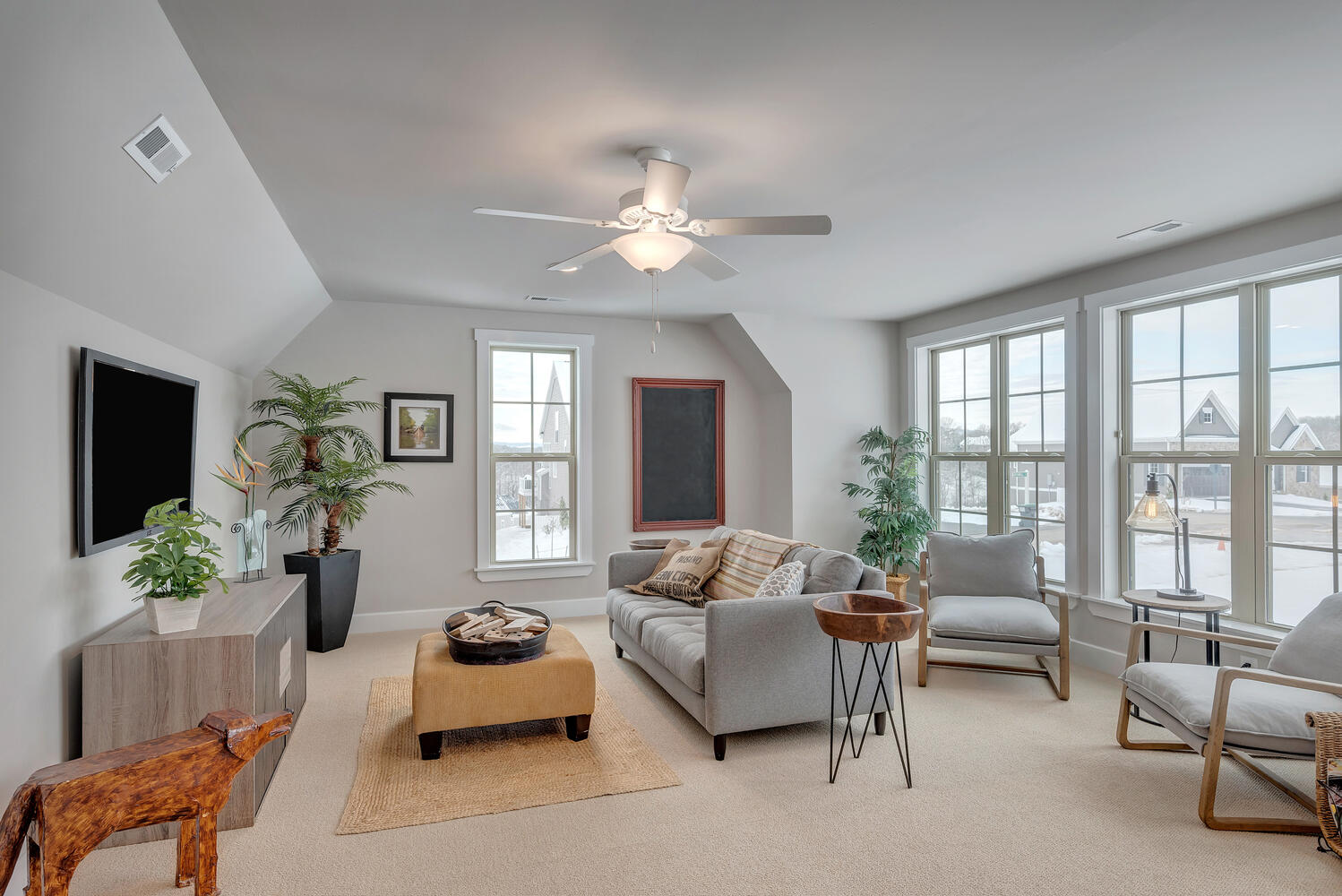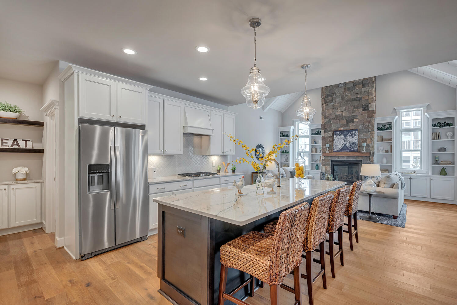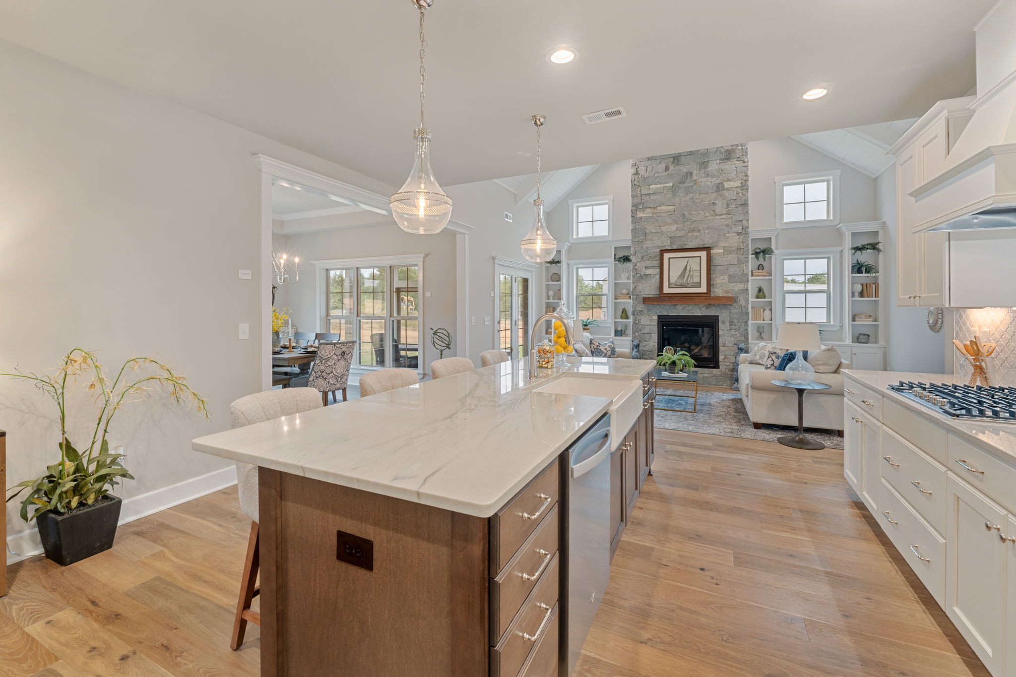 The Great Room, with its distinctive vaulted ceiling, is the focal point of the home. It is filled with natural light and boasts a fireplace and optional built-in bookshelves.